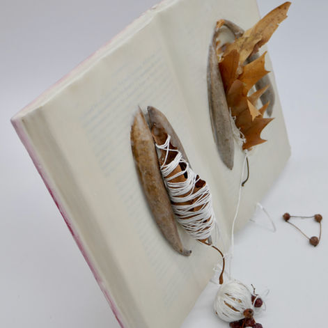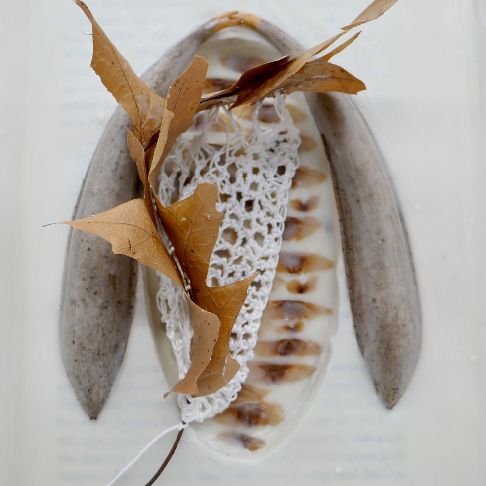 Book, dried leaves, seeds, crocheting yarn, wax